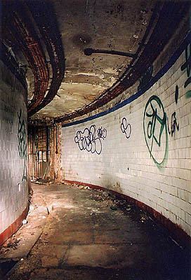 d'une trentaine de mètres de long, carrelé de haut en bas à la manière du métro,