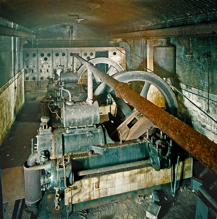 seul un éclairage puissant est capable de révéler ses secrets. C'est la plus grande de toutes les usines des Festen de la place de Metz. Dix moteurs Deutz monocylindres à quatre temps, à soupapes opposées, d'une quarantaine de litres de cylindrée, couplés chacun à une dynamo dorment à 10 mètres sous le sol de la forêt. La catégorie exacte de ces moteurs est encore assez mystérieuse : qu'ils soient Diesel est contesté, quant à l'allumage les éléments encore visibles ne permettent pas d'en certifier le mode. Ce qui est certain, c'est que les réservoirs superposés aux cylindres sont des vases d'expansion pour l'eau de refroidissement, qui échangeait probablement ses calories dans des radiateurs de déshumidification des galeries. Jadis ils fournissaient une puissance unitaire de 35 chevaux, soit quelque 26 kilowatts. Leur démarrage se fait par l'air comprimé contenu dans deux gros réservoirs. Le bâtiment, entièrement enterré, est nettement séparé des autres ouvrages puisqu'il n'est accessible que par la gaine reliant ceux de Mercy et d'Ars. Le large puits de manutention et la sortie de secours sont aujourd'hui comblés. Un tableau électrique dont il ne subsiste que l'exuvie et un ensemble de commutatrices complètent les installations. Un raffinement notable est la symétrisation de la dynamo et des organes annexes (distributeur, régulateur) selon l'orientation du moteur. |